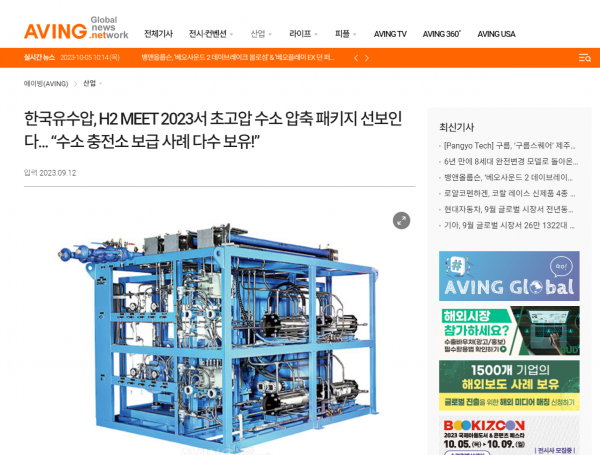 에이빙뉴스 - 한국유수압, H2 MEET 2023서 초고압 수소 압축 패키지 선보인다... “수소 충전소 보급 사례 다수 보유!”