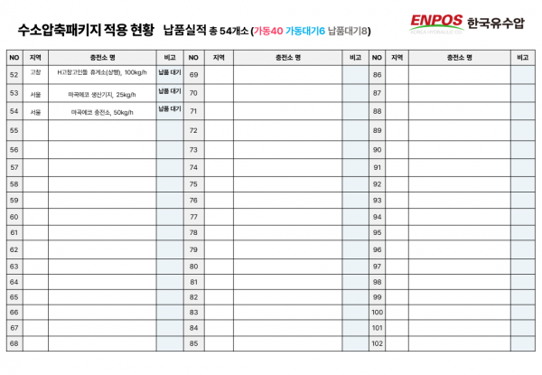 수소압축패키지 국내 적용 현황 (2025년 5월 기준) 페이지 정보 글쓴이 ENPOS 작성일21-08-20 11:34 조회3,987 댓글0 관련링크 https://blog.naver.com/enpos_korea/223326103819 698회 연결 Prev Next 목록 본문 2025년 5월 기준 당사 수소압축패키지 국내 적용 현황 입니다. 참고바랍니다. *클릭 시 이미지가 확대됩니다. Prev Next 목록
